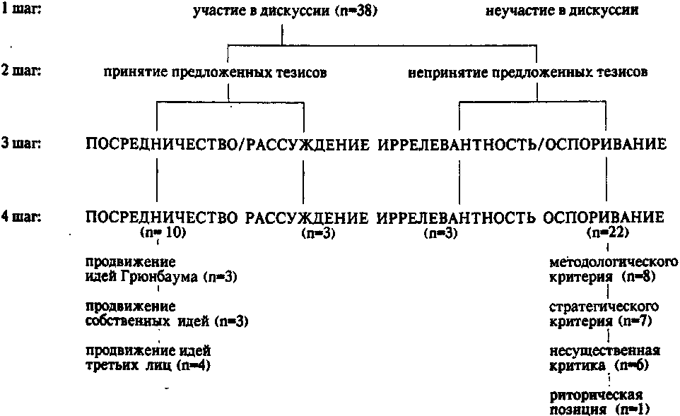 На первом мы проводим различие между участием и неучастием человека в дискуссии. Неучаствующие исключались из анализа; мы думаем, однако, что факт неучастия подлежит оценке. В нашем случае Грюнбаум интерпретирует неучастие Хабермаса и Рикера как значимое и агрессивное действие оппонентов.