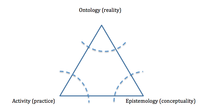 Признать, что некая теория обладает «практической адекватностью», не значит предполагать, что каждая её часть является практически отвечающей требованиям, не говоря уже о том, чтобы быть истинной, полезной для практики. Практика, знание и конкретная выработка знаний представляют собой комбинированный и неравномерный процесс. Определённые стороны продвигаются вперёд, другие помещаются в новые контексты, теряются, упускаются из виду или отбрасываются. На самом деле, не все аспекты практики или какой-то теории обязательно релевантны и могут быть излишними, неправильными или просто не иметь существенного значения, даже если могут функционировать как фоновые верования или над-верования, которые требуются в наших объяснениях. Наши теории всегда неполные, предвзятые, полидетерминированные и недоопределённые, говорят (нам) слишком много и слишком мало, в зависимости от языка и концептов, которые действуют в сочетании с практикой. Здесь я испытываю искушение назвать это тройной диалектикой или тройной герменевтикой между вопросом об онтологии (или реальности), практике (деятельности) и эпистемологии (концептуальности), не схлопываясь друг в друга.