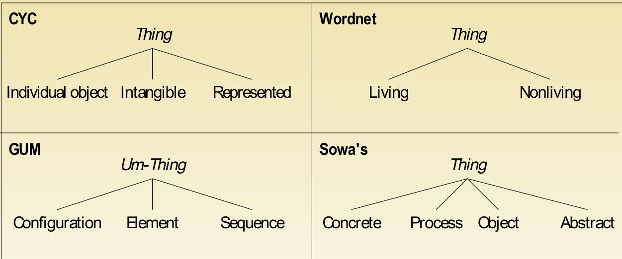 Например, объект CYC (проект по созданию объёмной онтологической базы знаний) имеет подкатегории индивидуальный объект, нечто неосязаемое и представленная вещь; um-объект обобщённой верхней модели 7 (GUM) имеет подкатегории конфигурация, элемент и последовательность; в Wordnet 8 (лексическая база данных английского языка) имеются подкатегории «живое» и «неживое», а в root T Sowa — подкатегории «конкретный», «процесс», «объект» и «абстрактный». (В статье Натальи Фридман Ной и Кэрол Хафнер эти различия обсуждаются более полно.9) Некоторые из этих различий возникают из-за того, что не все эти онтологии предназначены для использования в качестве инструментов общего назначения или даже в явном виде как онтологии. Другая причина различий заключается в том, что в принципе существует множество различных таксономий.