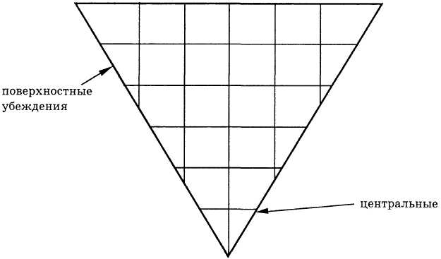 Терапевты уже знают, что верования клиентов образуют множество слоев. Существуют поверхностные верования и верования, лежащие под ними. Эти когниции связаны между собой психологически. Терапевт может пояснить это клиенту, нарисовав перевернутую пирамиду, изображенную на рис. 3.1.